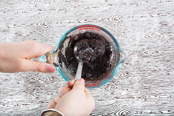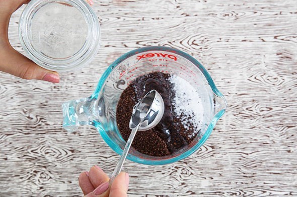 Αφού συγκεντρώσετε τα υλικά, ρίξτε το αλάτι ή τη ζάχαρη και τον καφέ σε ένα μπολ.