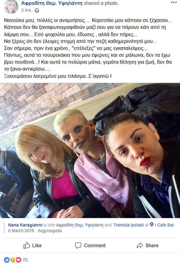 Η καλή της φίλη και δημοσιογράφος Αφροδίτη Υψηλάντη, ένα χρόνο μετά, ανέβασε ένα συγκινητικό μήνυμα στην προσωπική της σελίδα στο Facebook.