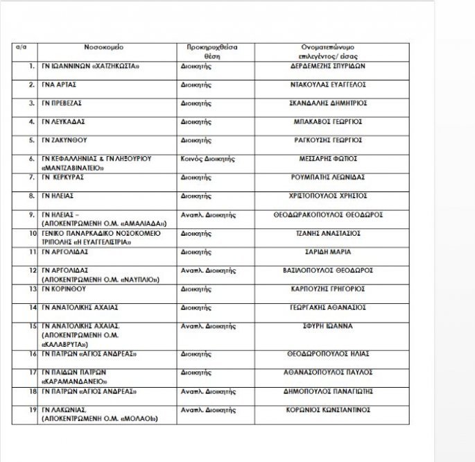Επισυνάπτονται οι πίνακες, όπως ανακοινώθηκαν από το υπουργείο Υγείας ανά υγειονομική περιφέρεια, με τους διοικητές και υποδιοικητές που αναλαμβάνουν καθήκοντα στα νοσοκομεία.