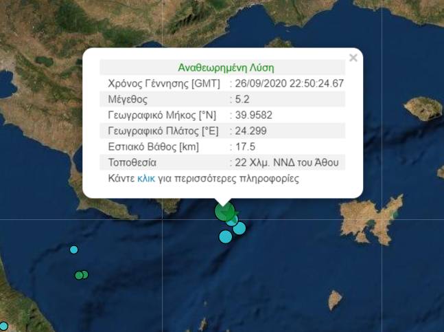 Σεισμική δόνηση 5,2 της κλίμακας Ρίχτερ σημειώθηκε στις 1:50 τα ξημερώματα της Κυριακής 27 Σεπτεμβρίου 2020 ανοιχτά της Χαλκιδικής.