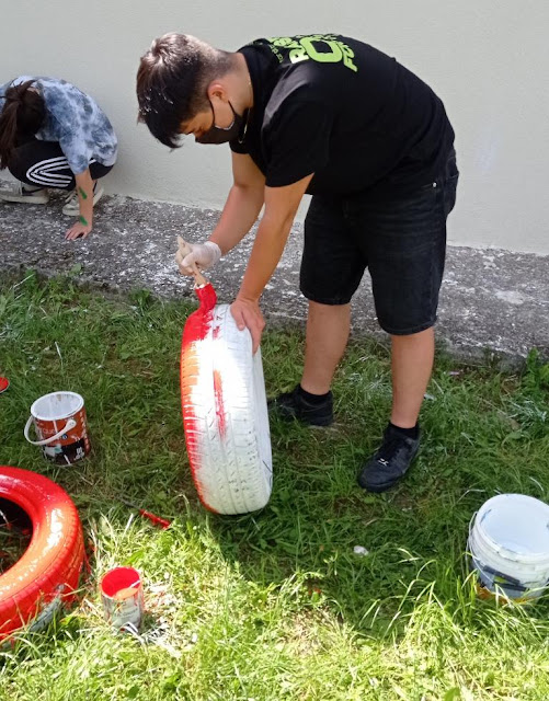 Ειδικότερα, στο πλαίσιο του μαθήματος της Τεχνολογίας, τα παιδιά επαναχρησιμοποίησαν με δημιουργικό τρόπο παλιά λάστιχα αυτοκινήτων και τα μετέτρεψαν σε όμορφα, πολύχρωμα παρτέρια στα οποία φύτεψαν κάθε λογής λουλούδια.