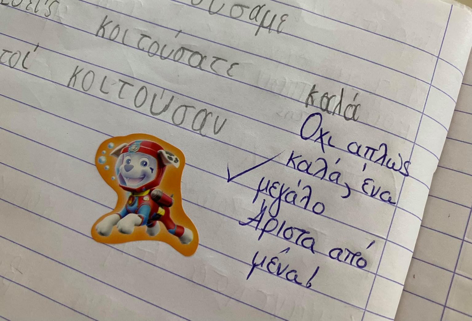 Αυτό που μας ενθουσίασε είναι τα σχόλια που χρησιμοποίησε, όταν διόρθωνε γραπτά ορθογραφίας μαθητών, στα πλαίσια της επιβράβευσης ως κίνητρο μάθησης. Τι το ξεχωριστό έκανε; Ζήτησε από τους μαθητές του μα προσθέσουν μία λέξη ενθάρρυνσης για την προσπάθειά τους, στο τέλος της άσκησης. Τα παιδιά όντως ανταποκρίθηκαν και όλα έγραψαν κάτι θετικό. Στη συνέχεια, ανέλαβε ο ίδιος και έγραψε το δικό του ξεχωριστό μήνυμα επιβράβευσης, στο σχόλιο κάθε μαθητή.