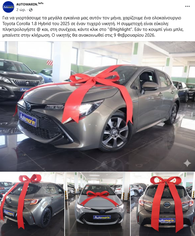 Την Τετάρτη, εμφανίστηκε νέα παρόμοια ανάρτηση για δήθεν κλήρωση ενός Toyota Corolla 1.8 Hybrid. Οι οδηγίες είναι οι ίδιες και μέχρι στιγμής έχουν γίνει περισσότερα από 1.300 σχόλια και 749 κοινοποιήσεις.