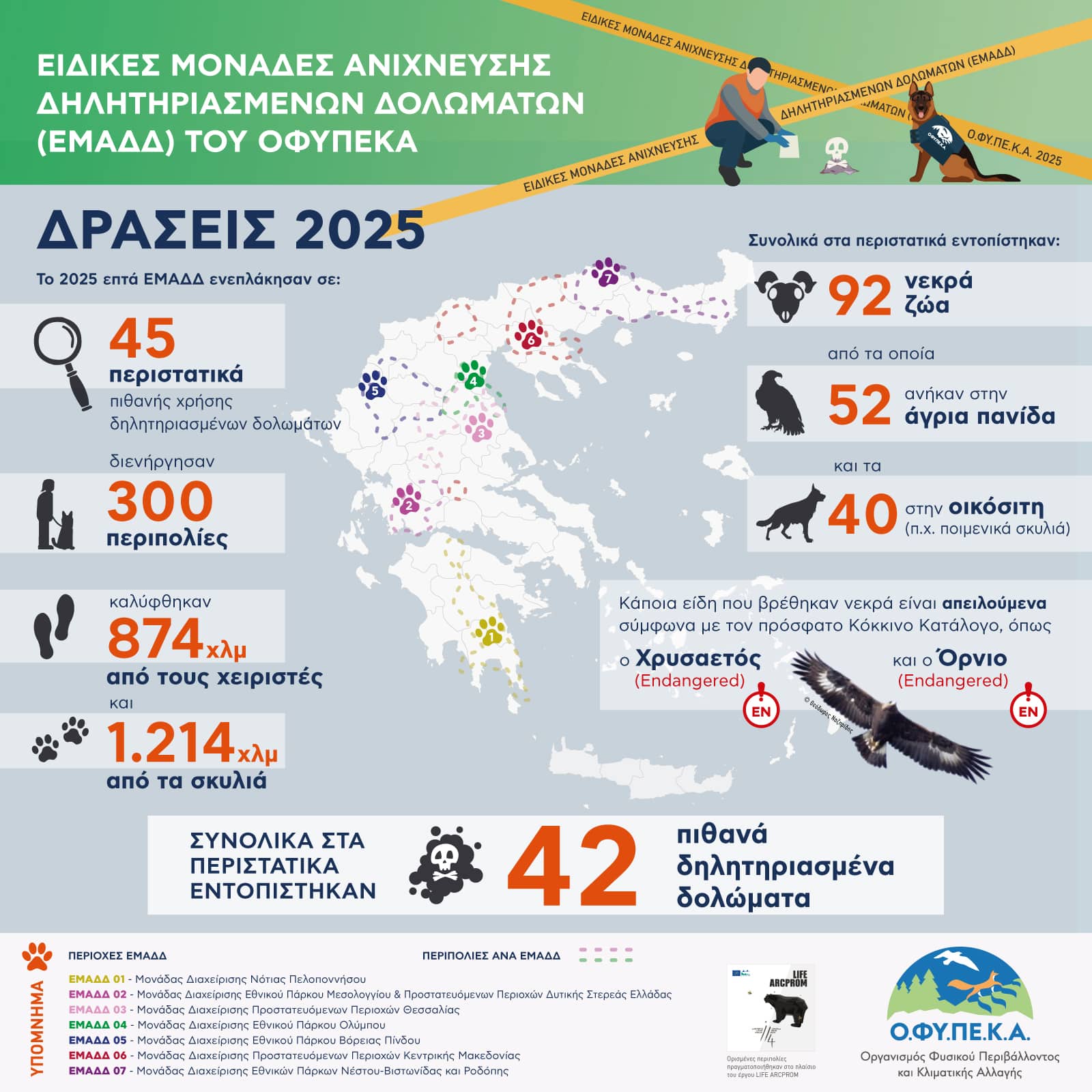 Ο ΟΦΥΠΕΚΑ παρουσίασε τον απολογισμό των δράσεων των ΕΜΑΔΔ για το 2025 με αφορμή την Εθνική Ημέρα Δράσης κατά των Δηλητηριασμένων Δολωμάτων, όπως έχει καθιερωθεί με πρωτοβουλία των υπουργείων Περιβάλλοντος και Ενέργειας, και Αγροτικής Ανάπτυξης και Τροφίμων η 22α Φεβρουαρίου.